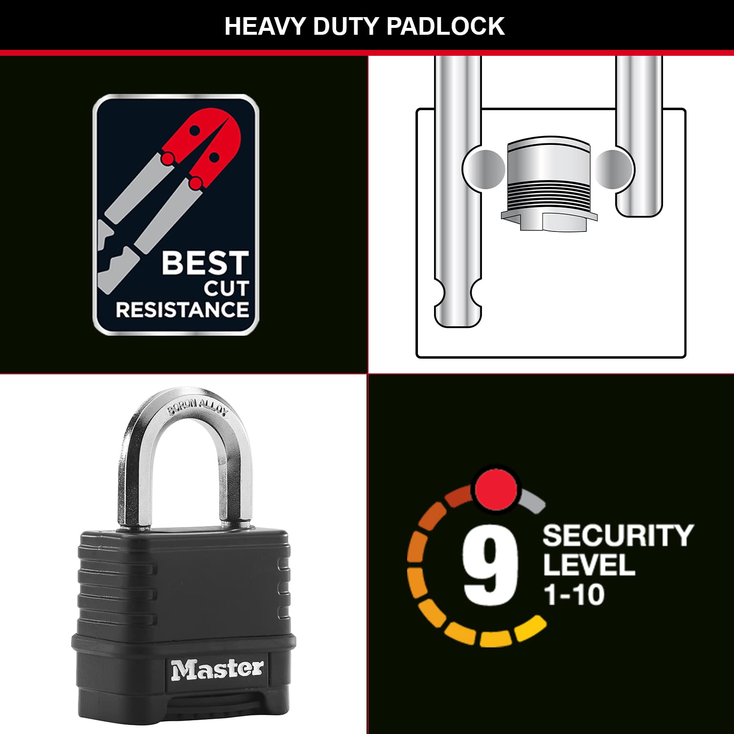 • High security shackle: tough-cut octagonal boron-carbide shackle that is 50% harder than hardened steel and deadlocking mechanism protects against prying, shimming and Rap attacks..